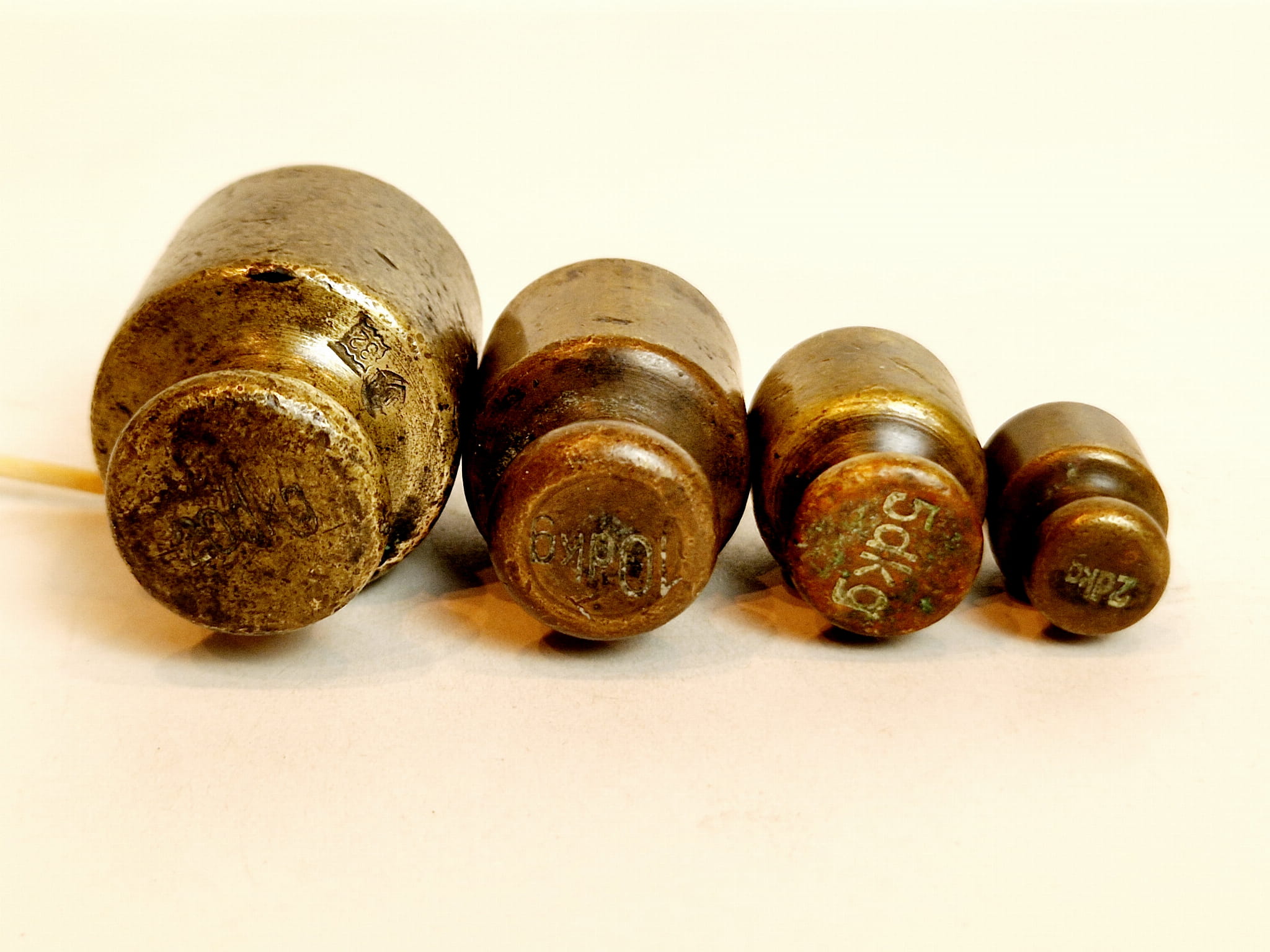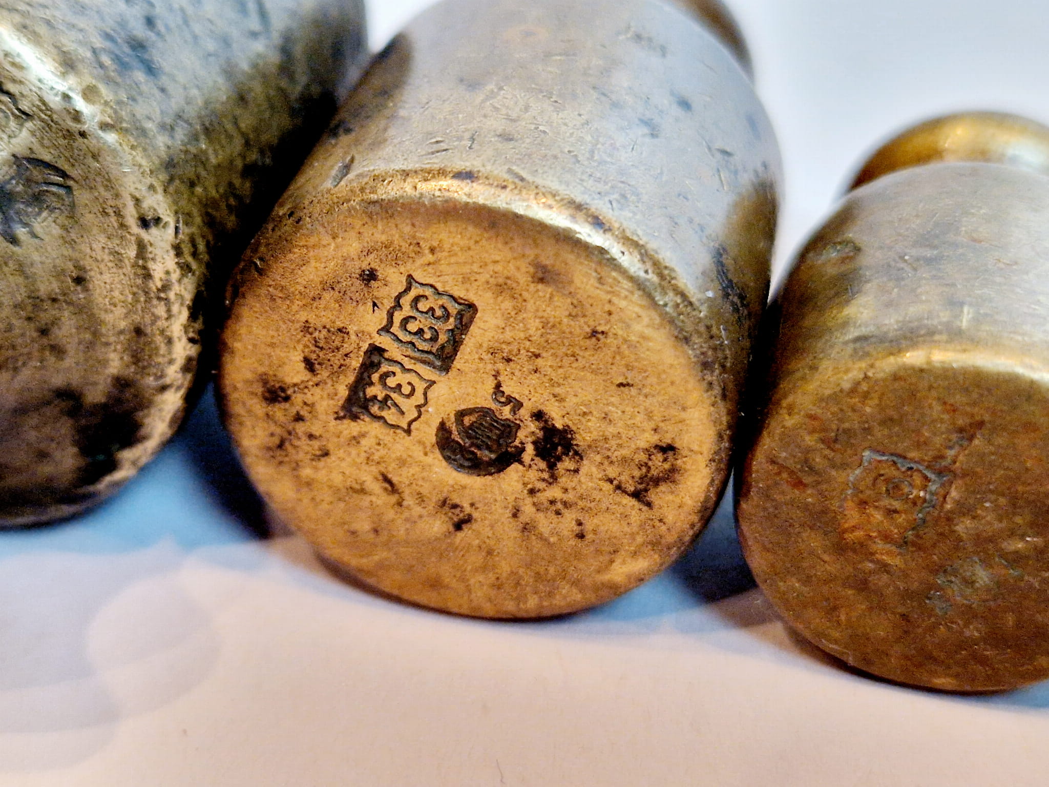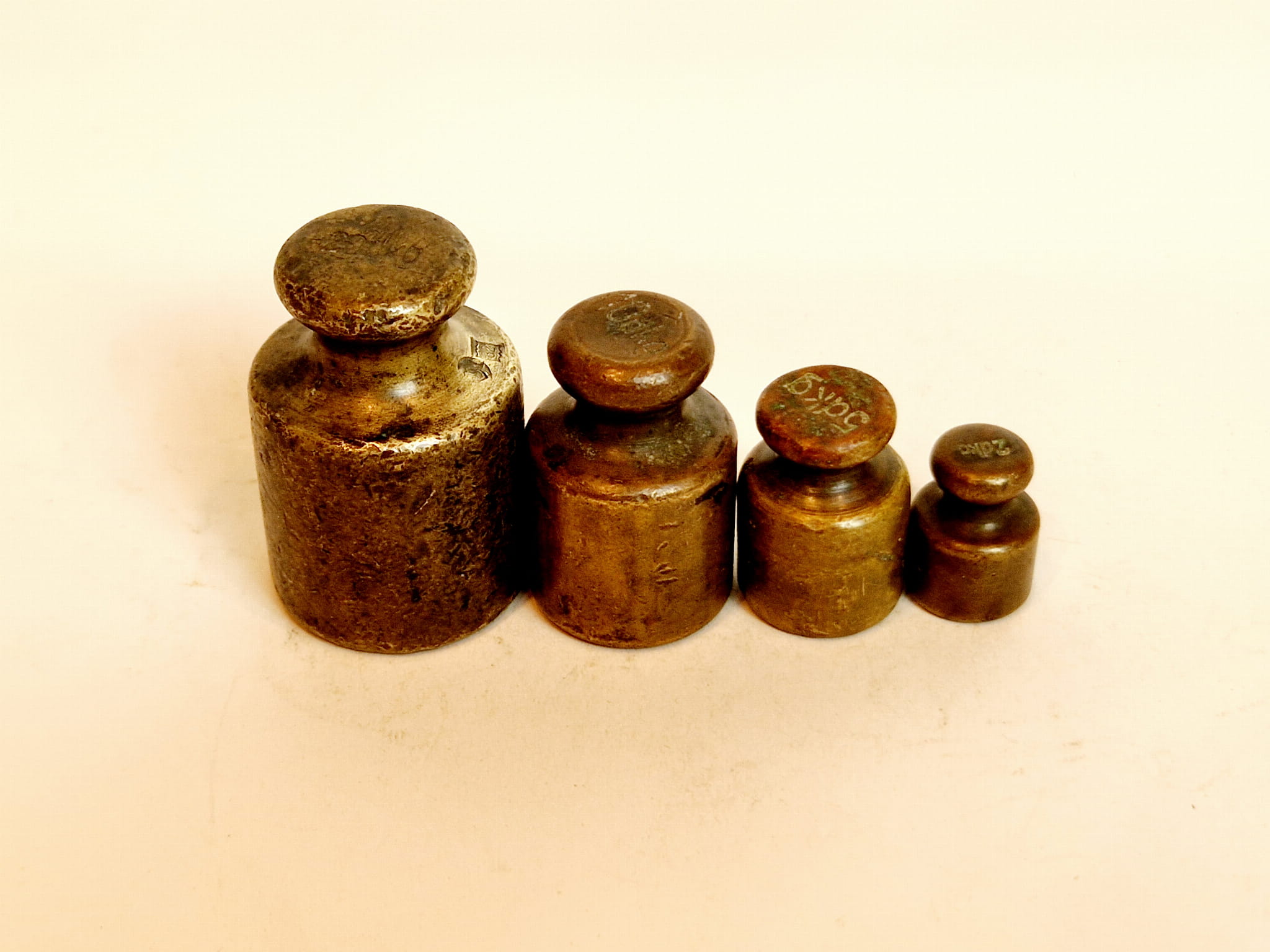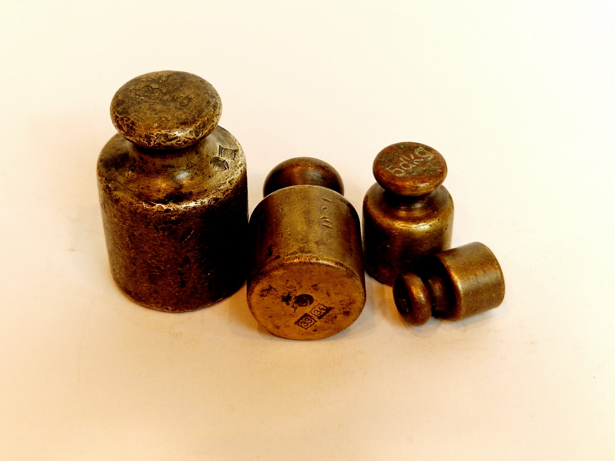Odważniki nie były czyszczone - pokryte są oryginalną, starą, ciemną patyną.