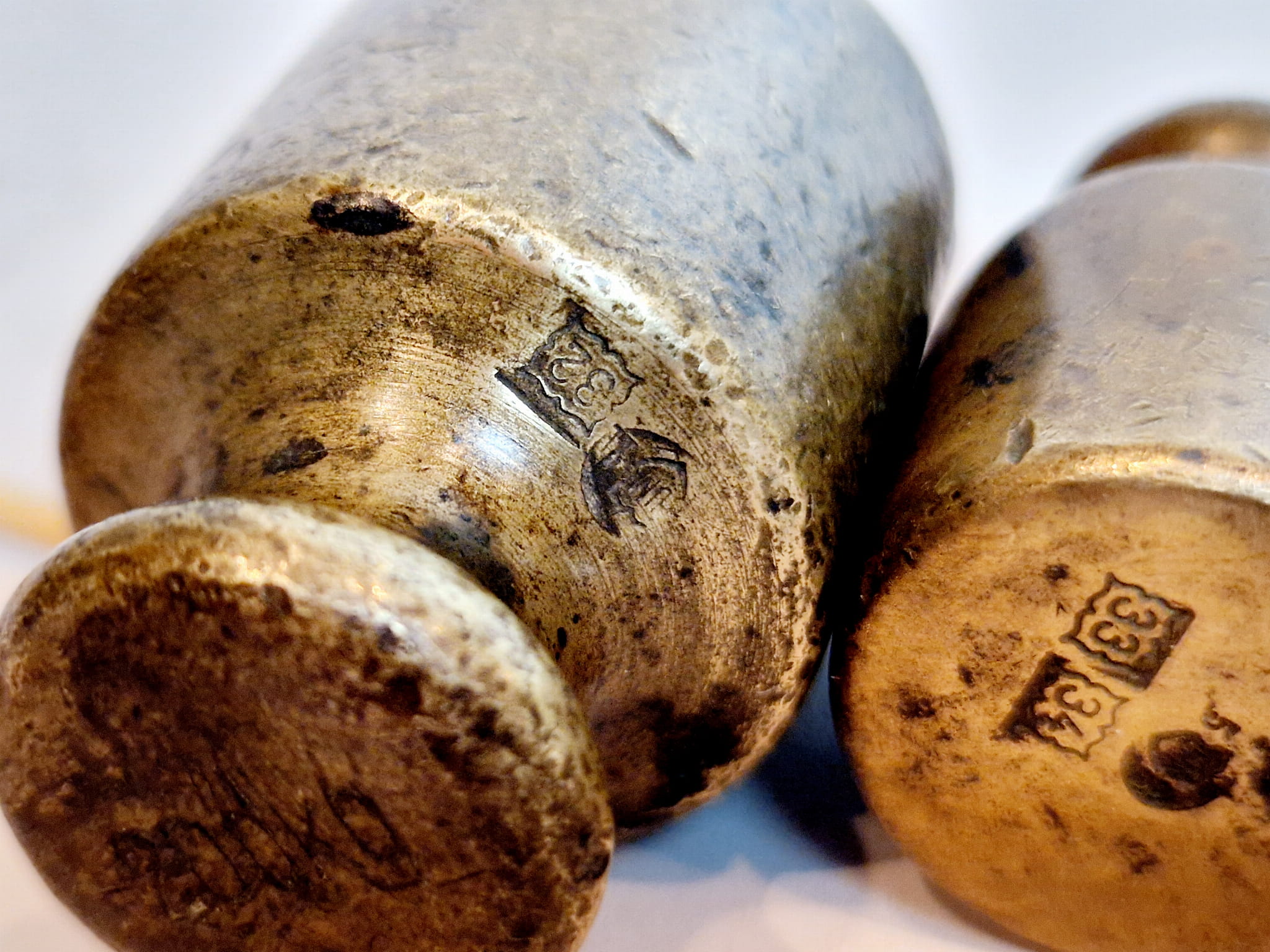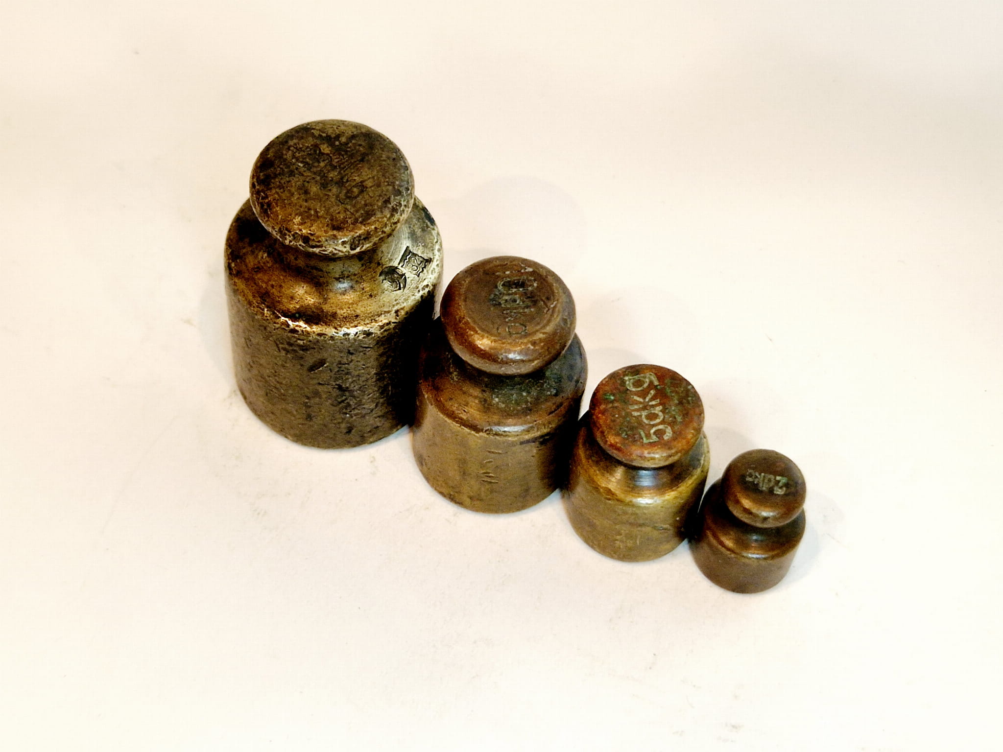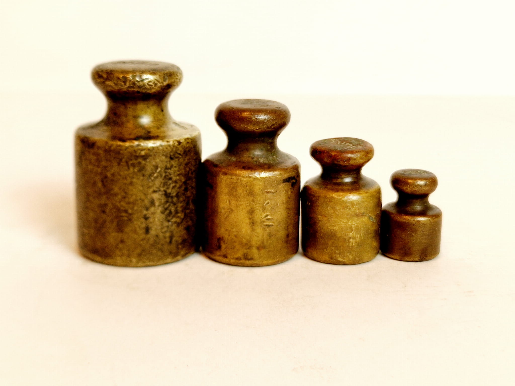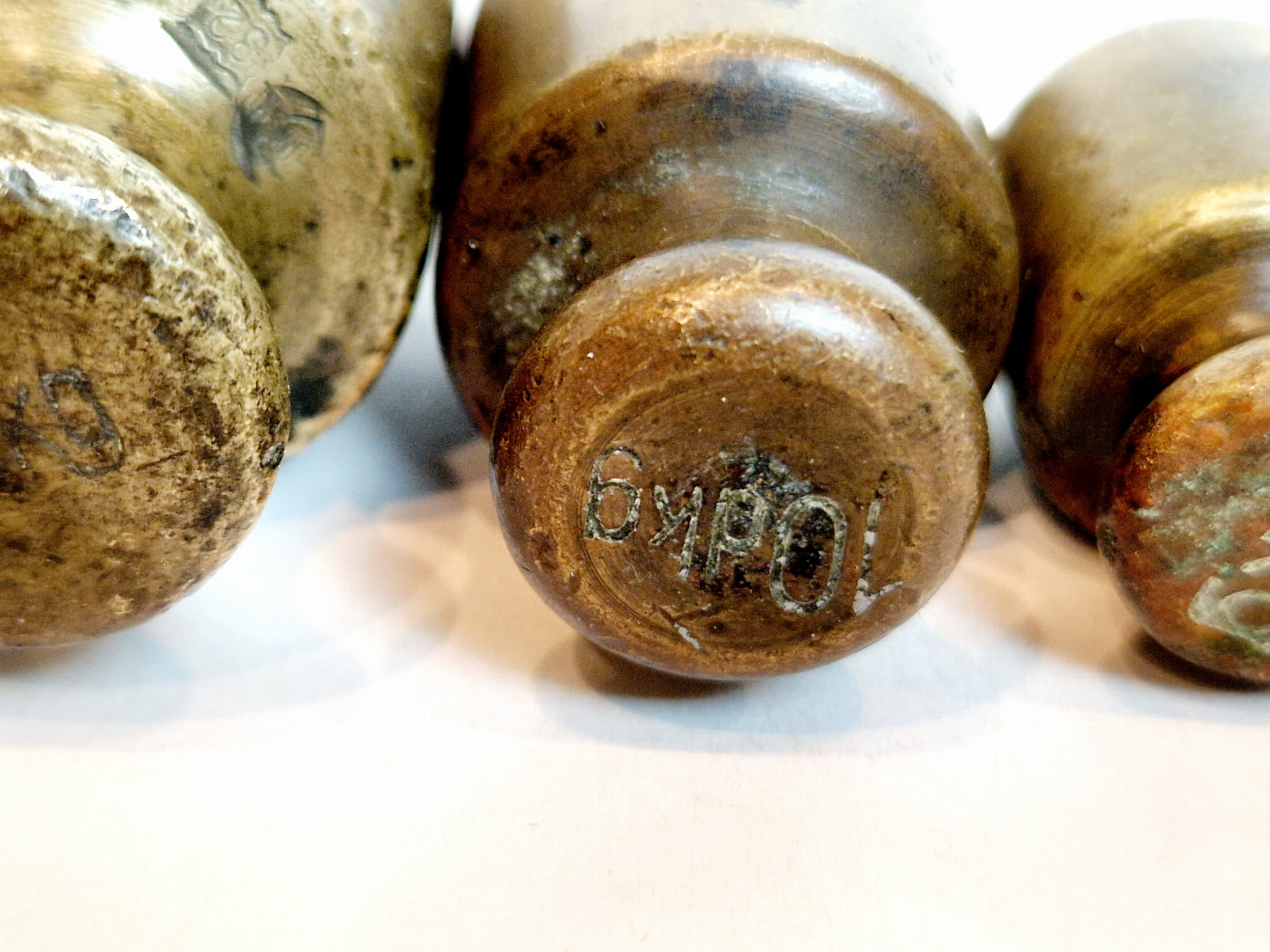 Odważniki nie były czyszczone - pokryte są oryginalną, starą, ciemną patyną.