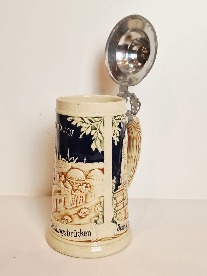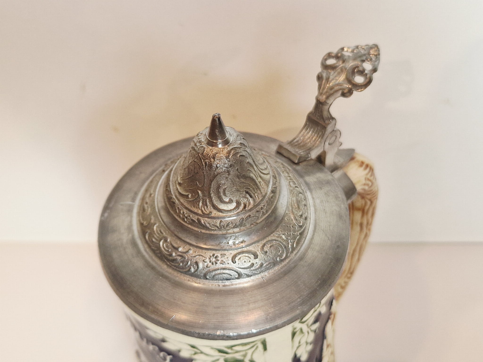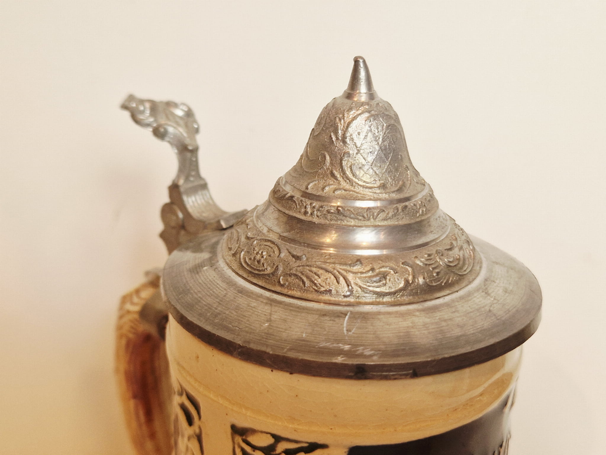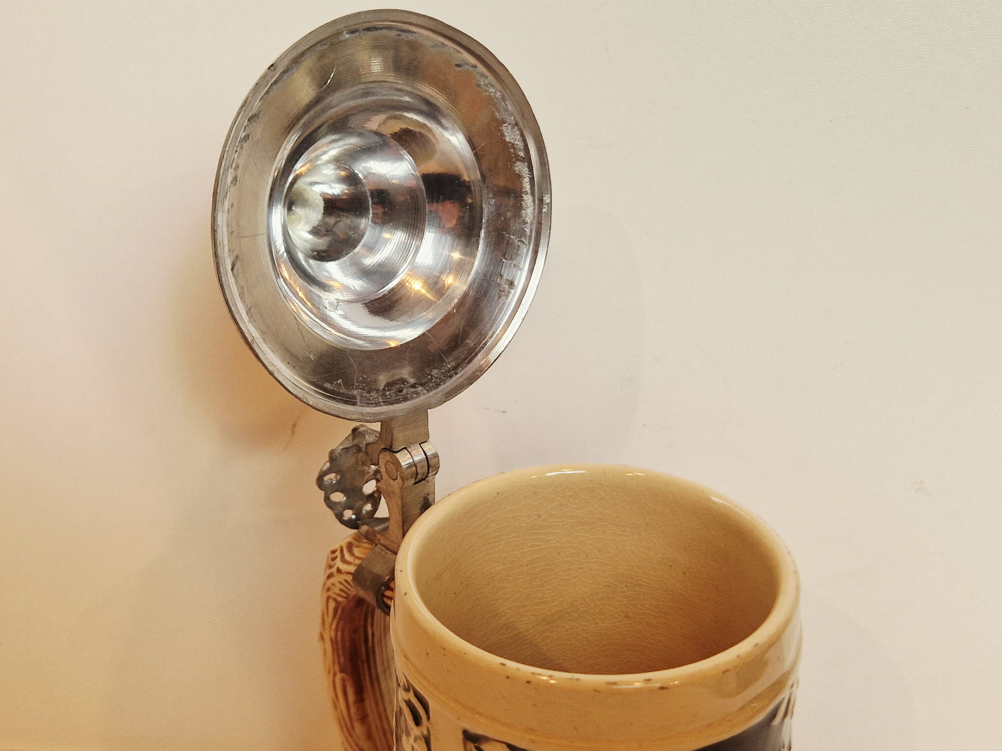 STARY (l. 40 / 50-te XX w) KOLEKCJONERSKI KUFEL CERAMICZNY Z CYNOWĄ POKRYWKĄ