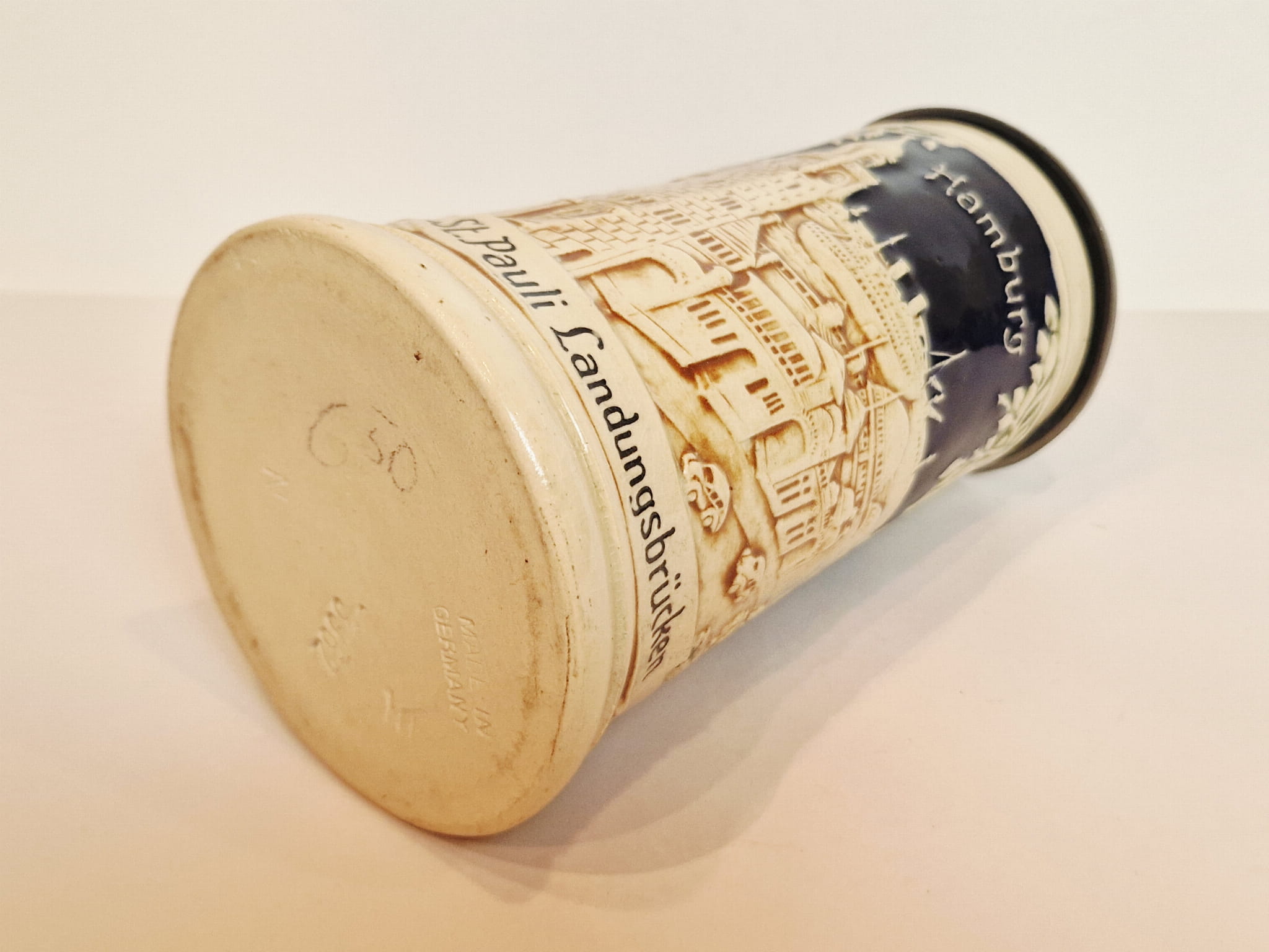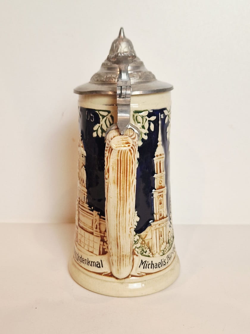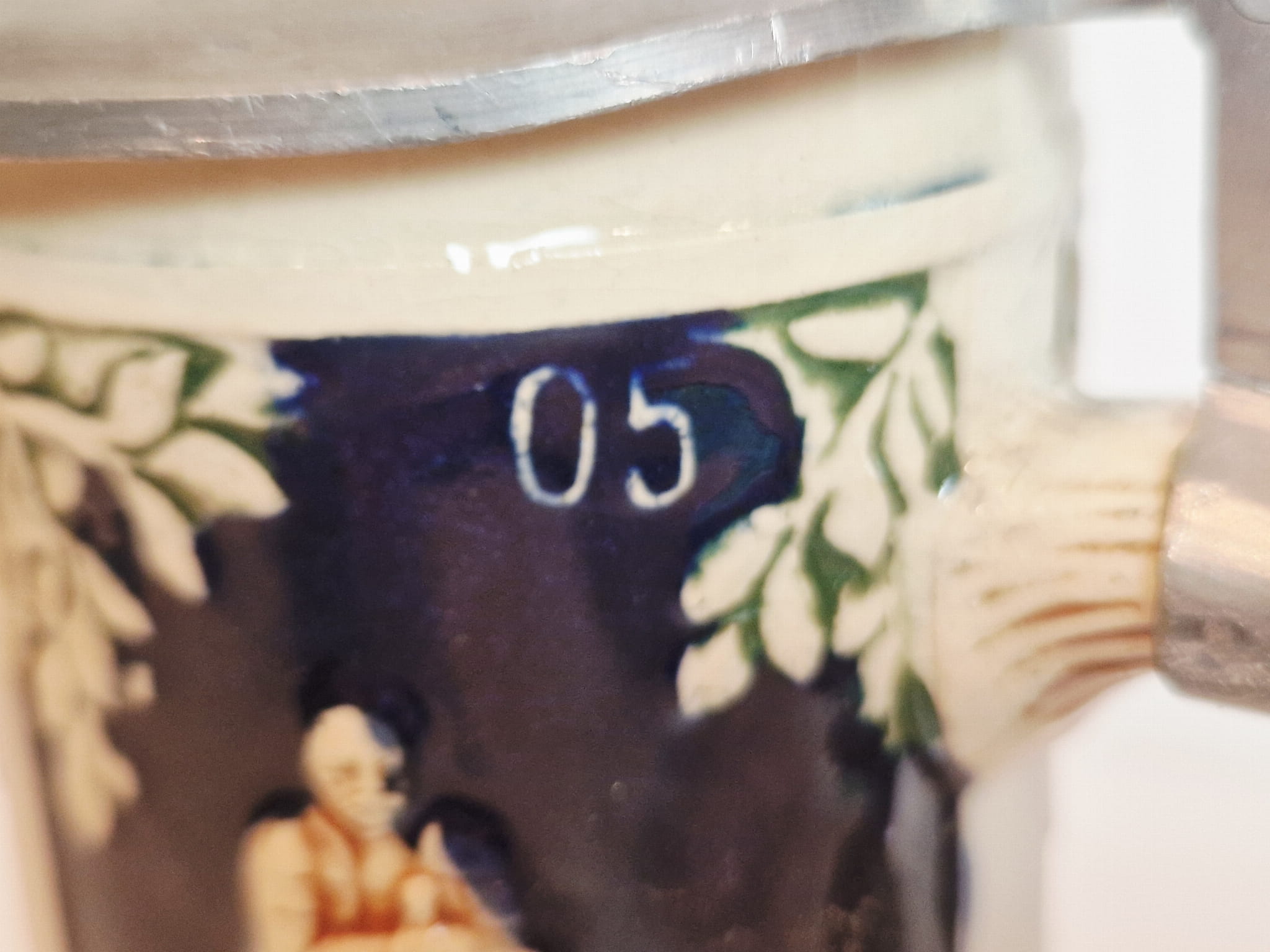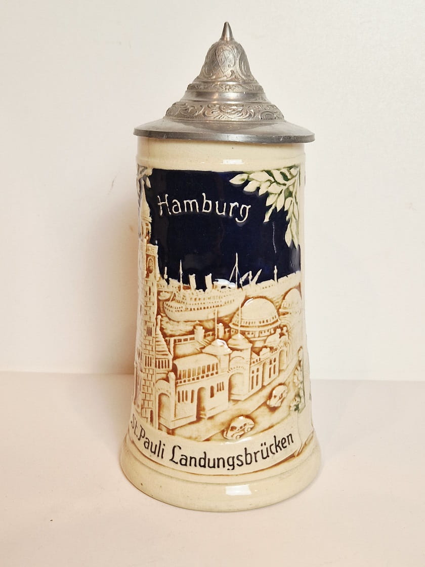 STARY (l. 40 / 50-te XX w) KOLEKCJONERSKI KUFEL CERAMICZNY Z CYNOWĄ POKRYWKĄ