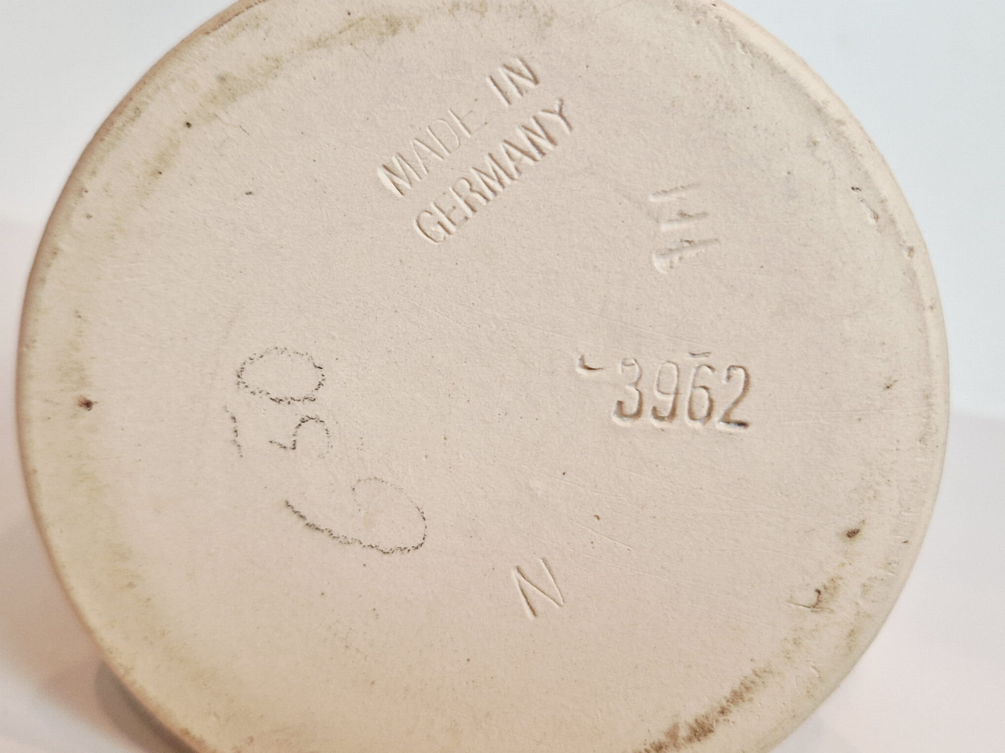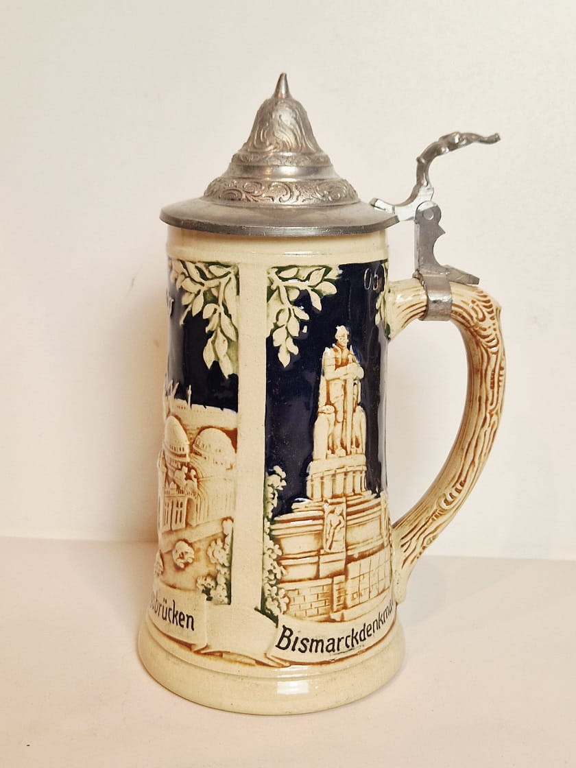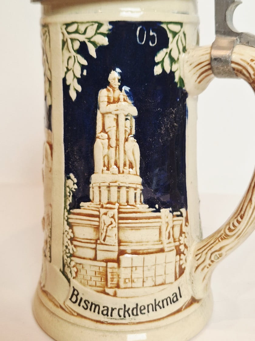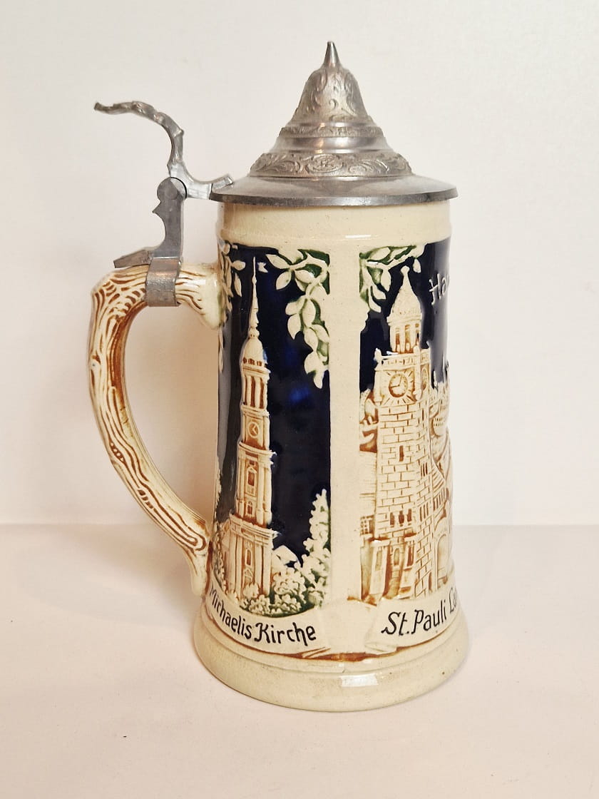 STARY (l. 40 / 50-te XX w) KOLEKCJONERSKI KUFEL CERAMICZNY Z CYNOWĄ POKRYWKĄ