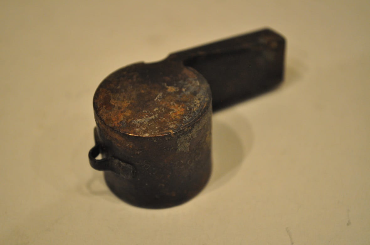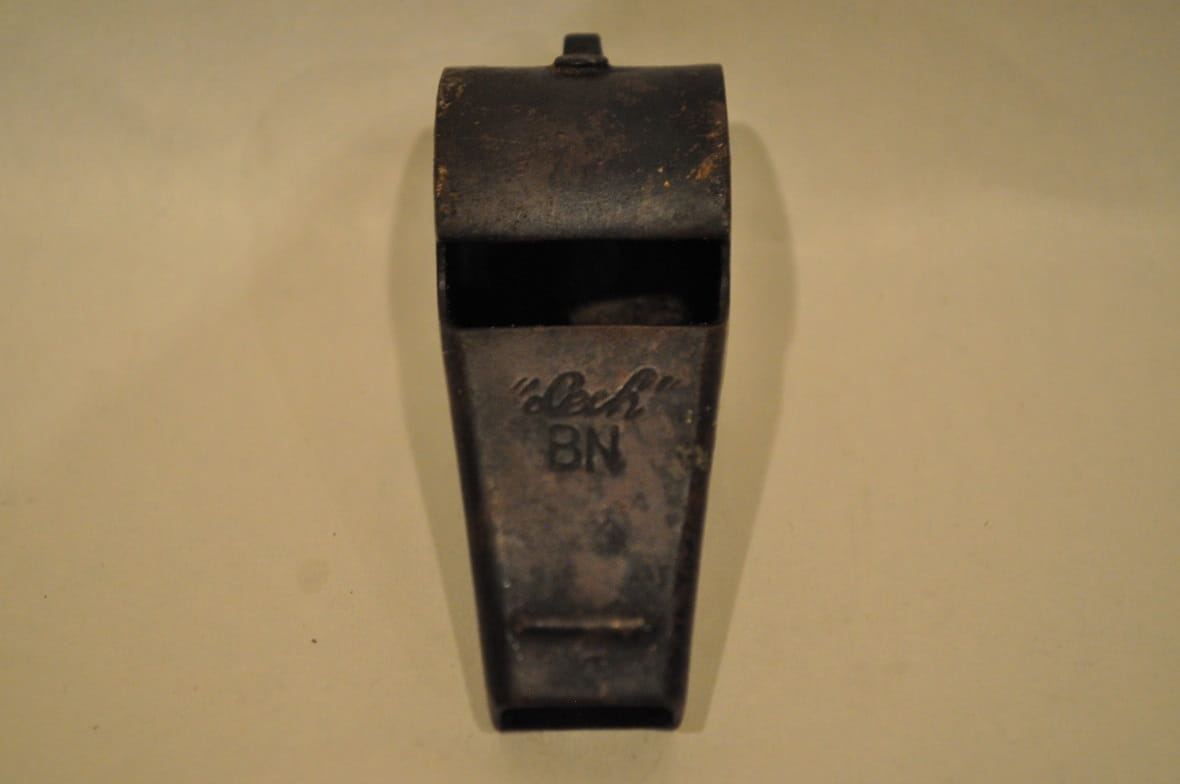 "Gwizdki tego rodzaju stosowane były na okrętach przy wciąganiu bandery, wyposażano w nie łodzie, tratwy i pasy ratunkowe. Oferowany egzemplarz pochodzi z lat 40 / 50-tych XX w. Oznaczenie "Lech" może dotyczyć nazwy tego rodzaju gwizdka albo producenta. podobne gwizdki miały też oznaczenia BURZA, DRUCH i ORZEŁ..."