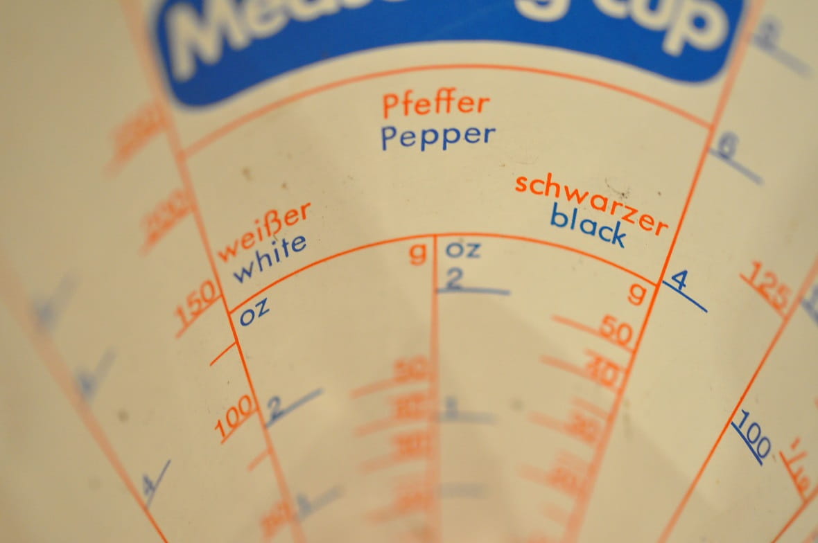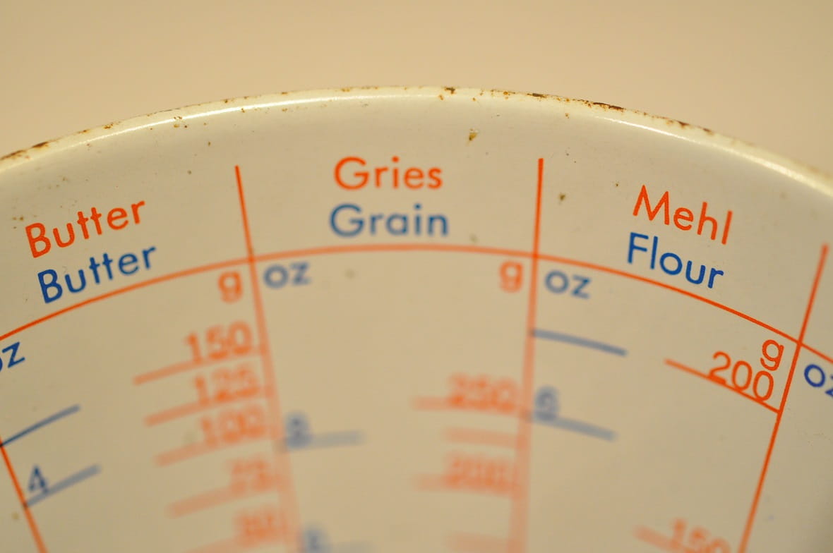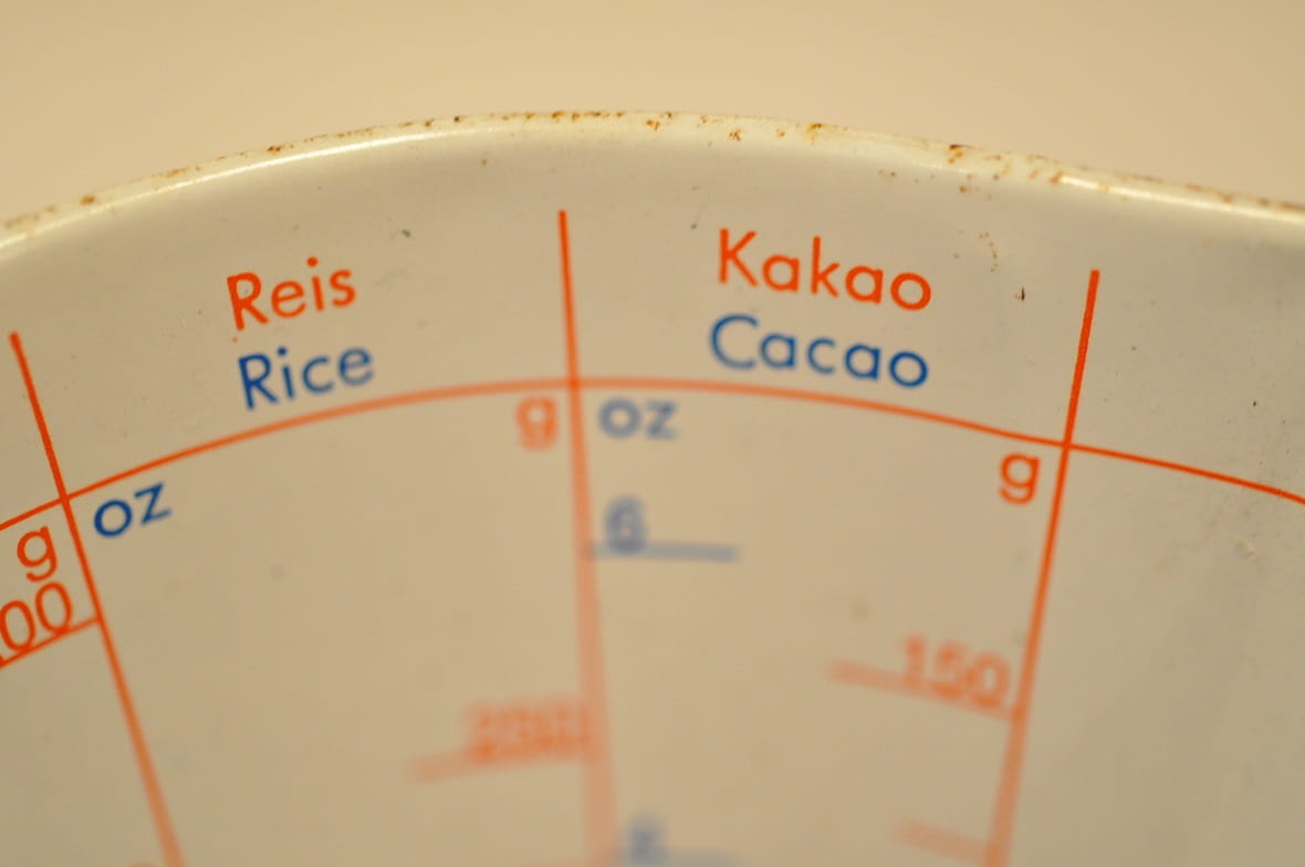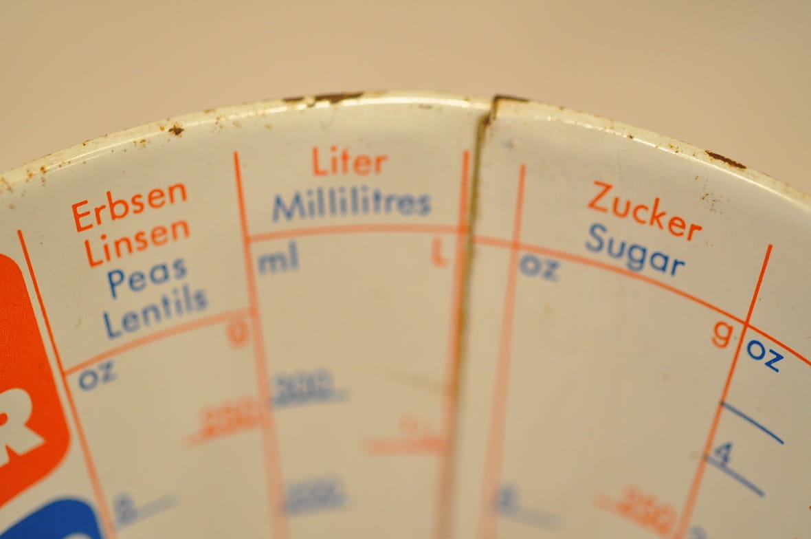 Zachowane, w pełni czytelne oznakowania skal miarowych produktów.
