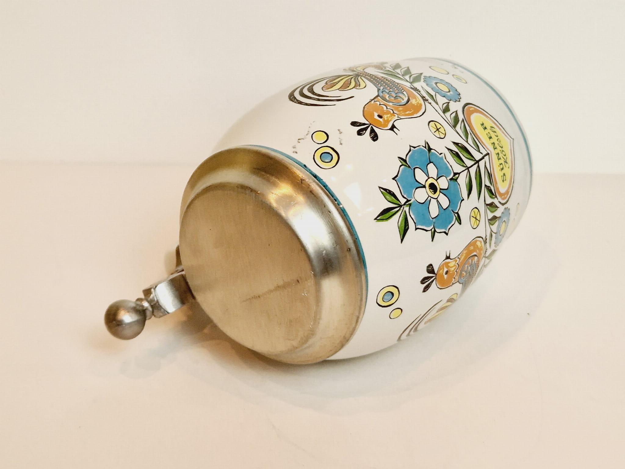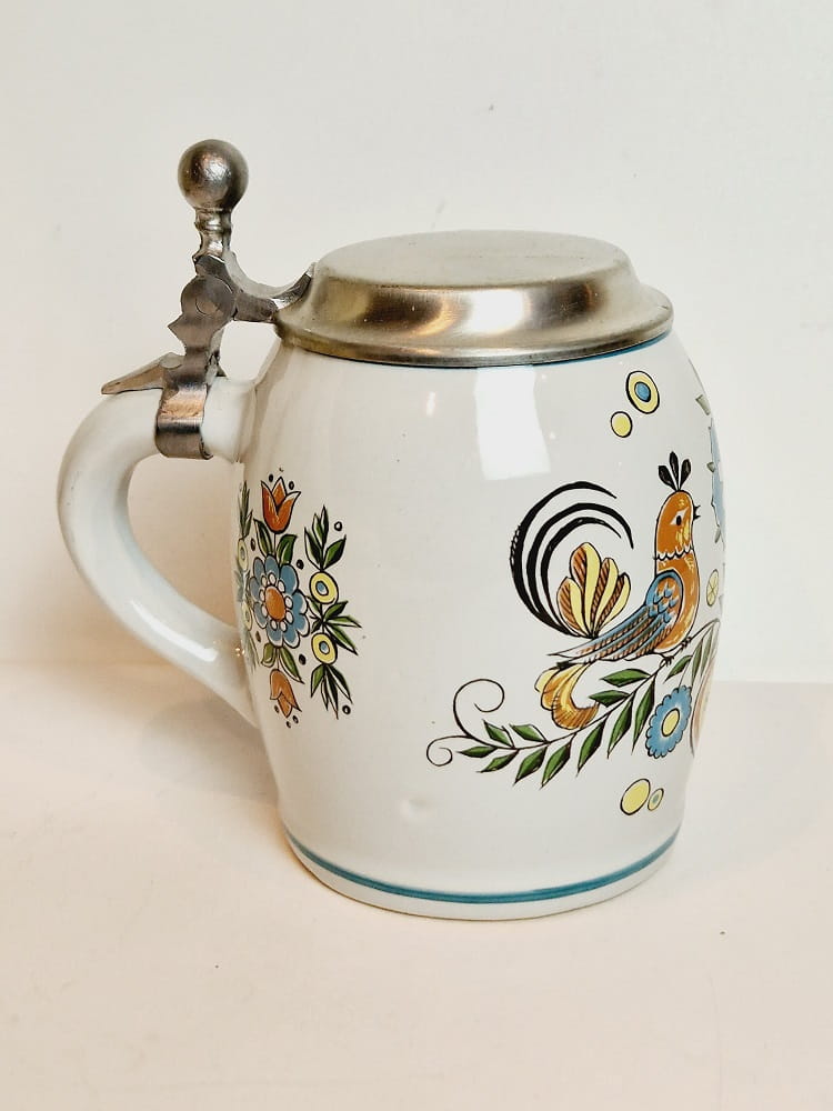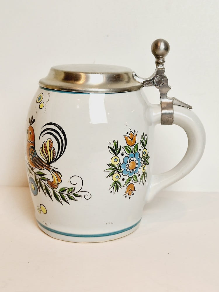 STARY (l. 60-te XX w) MASYWNY (740 g) KOLEKCJONERSKI KUFEL CERAMICZNY Z CYNOWĄ POKRYWKĄ