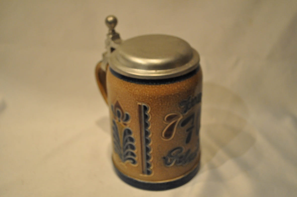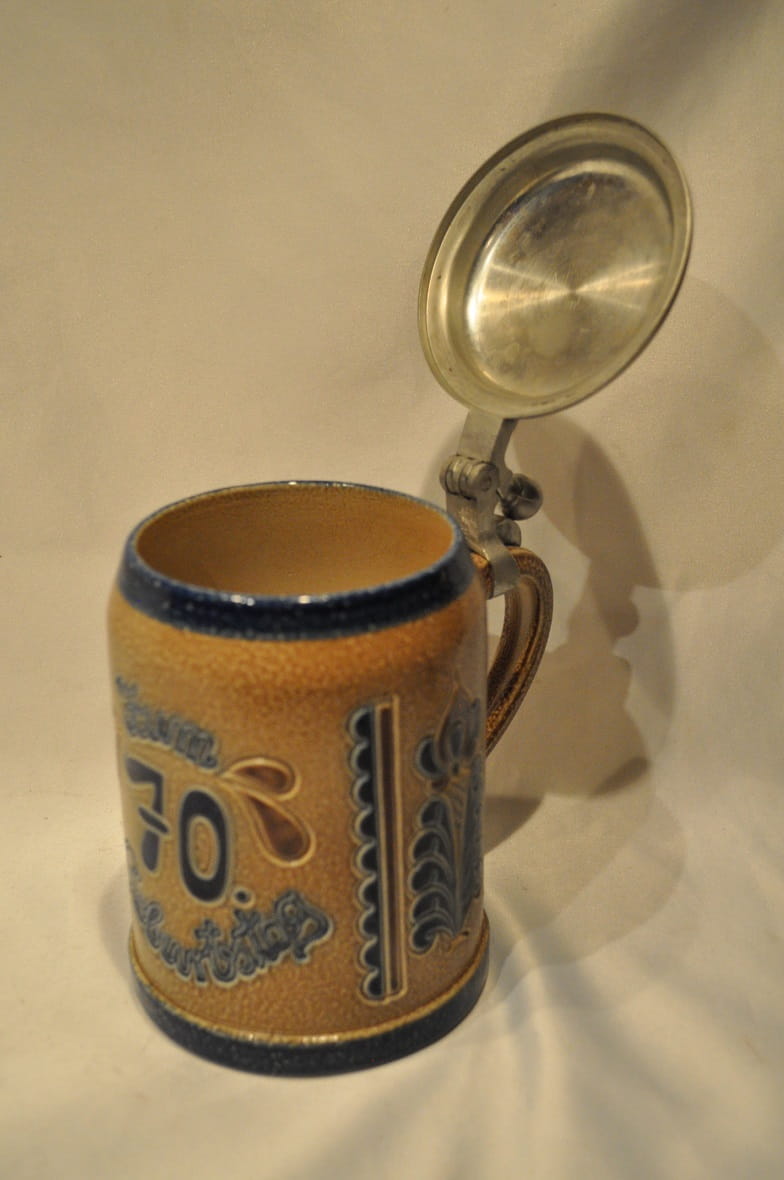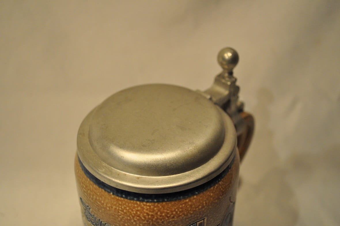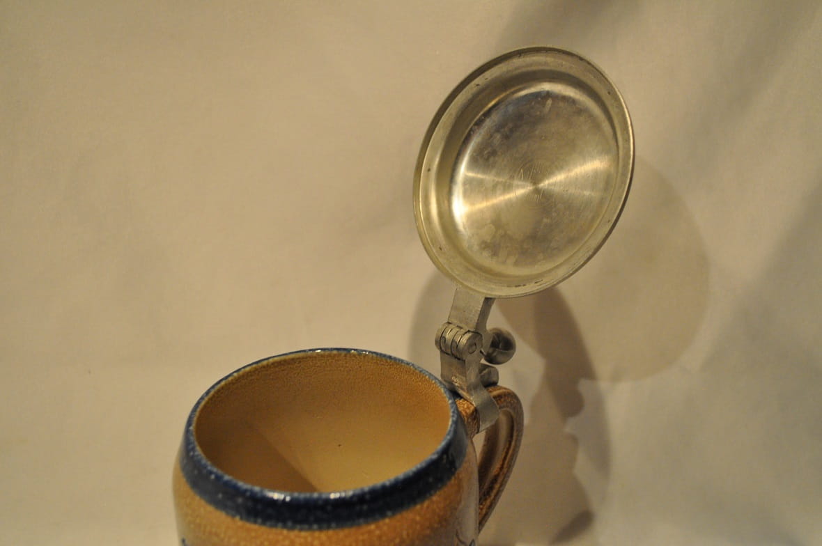 STARY (l. 60 / 70-te XX w) MASYWNY (878 g) KOLEKCJONERSKI KUFEL KAMIONKOWY (szkliwienie solne) Z CYNOWĄ POKRYWKĄ