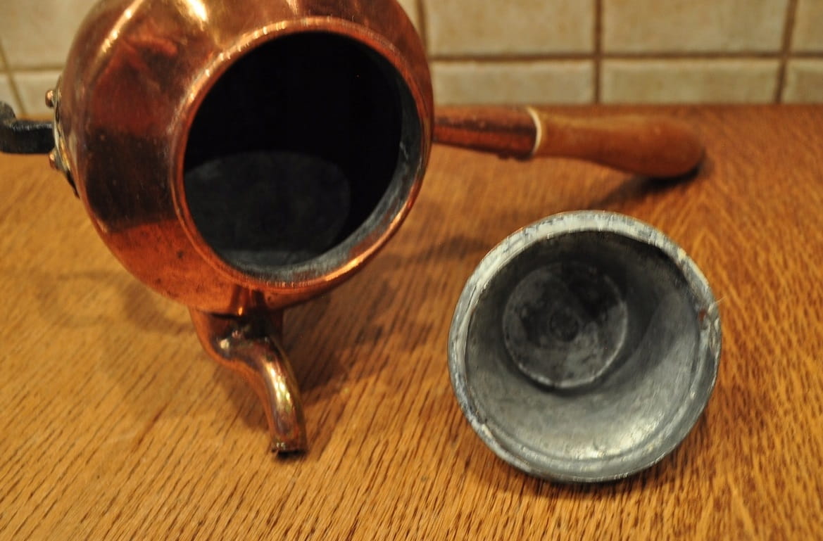 Czajnik nie był czyszczony - pokryty na zewnątrz starą patyną a wewnątrz śniedziowym nalotem.