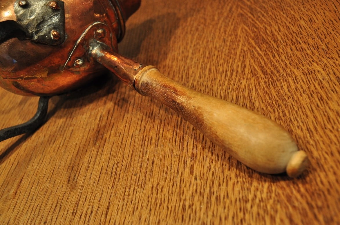 Uchwyt drewniany osadzony w miedzianej oprawie nitowanej miedzią - stabilny - w bardzo dobrym stanie zachowania.