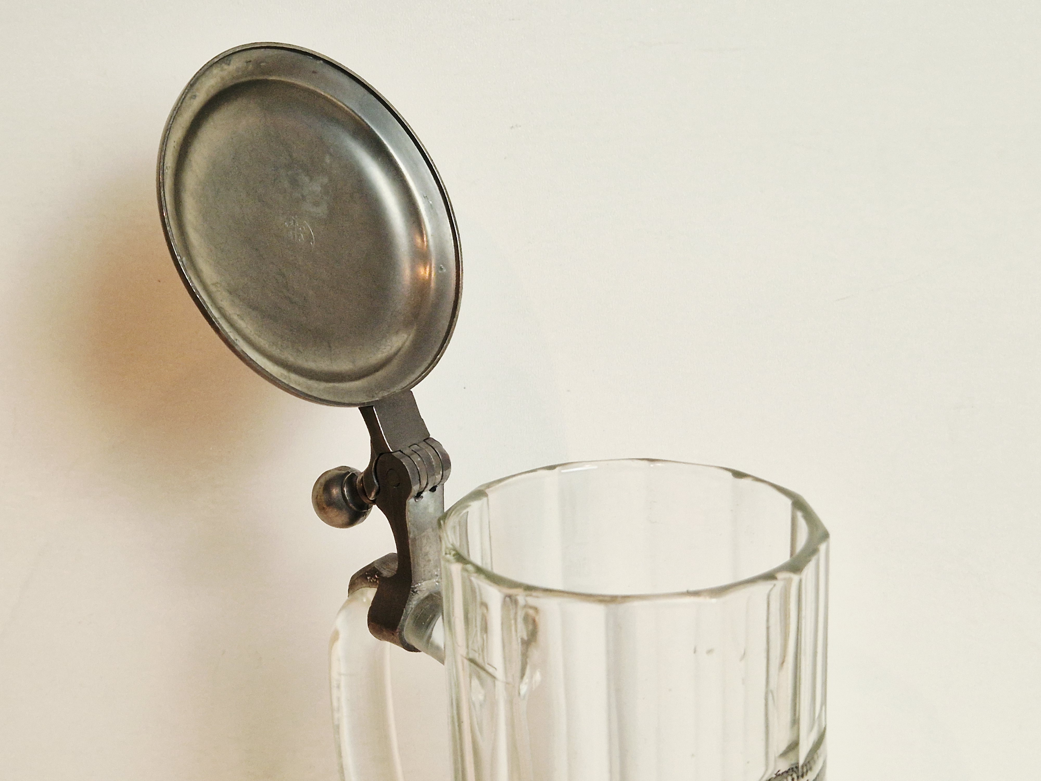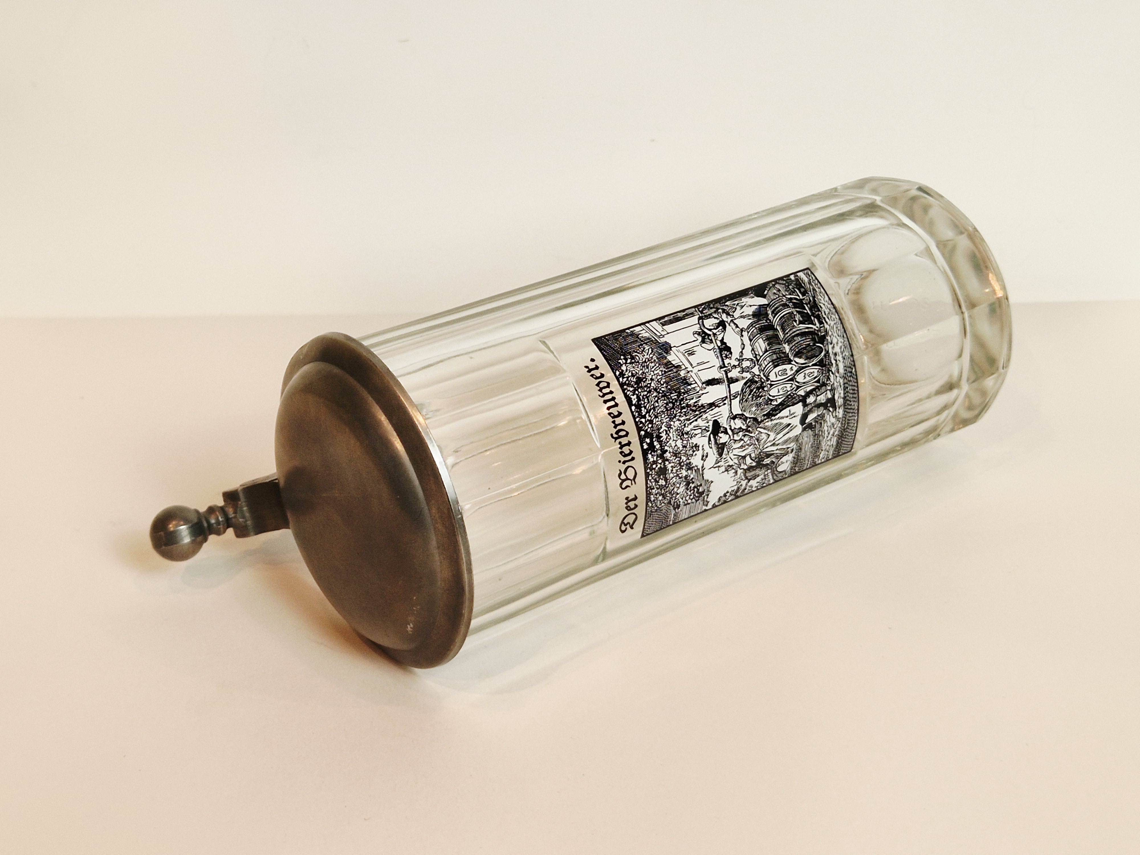STARY (l. 70 / 80-te XX w) KOLEKCJONERSKI KUFEL SZKLANY Z CYNOWĄ POKRYWKĄ