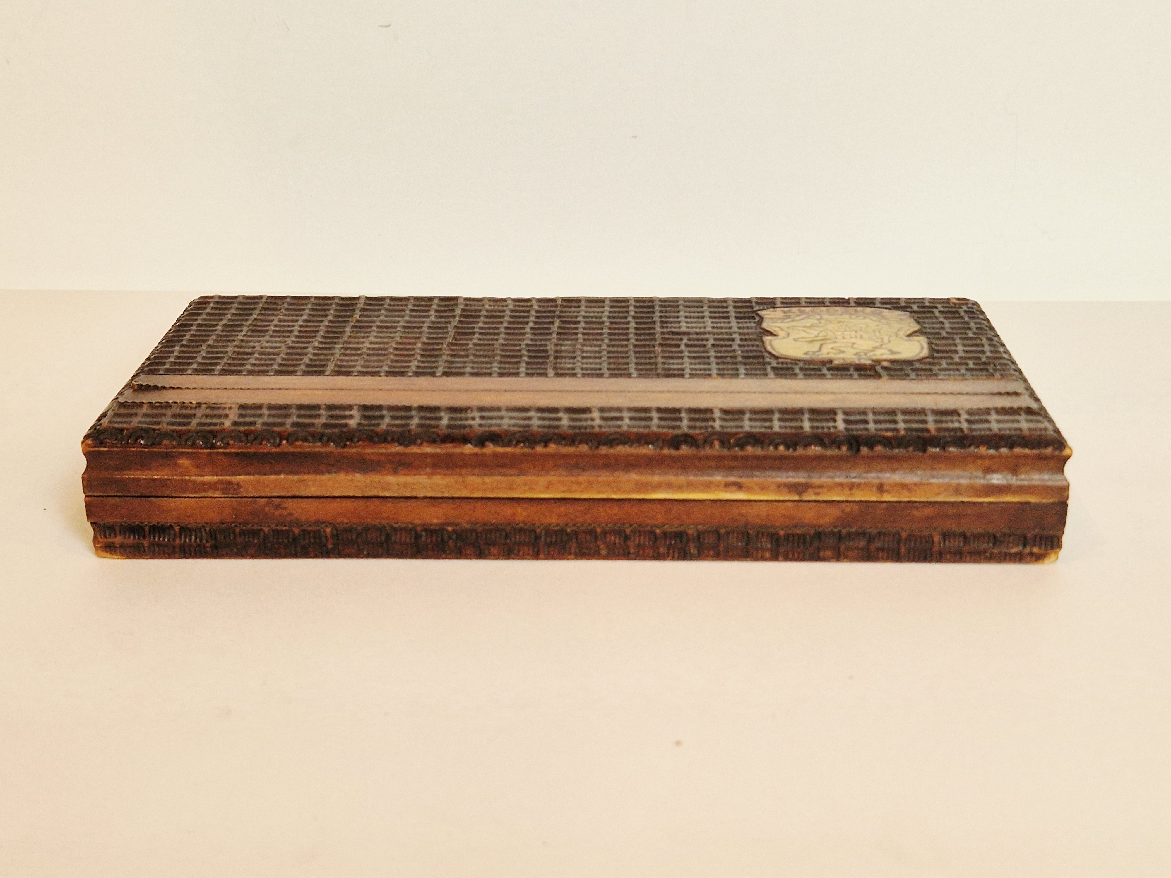 Papierośnica zdobiona - wypalana oraz nabita mosiężną inkrustacją...