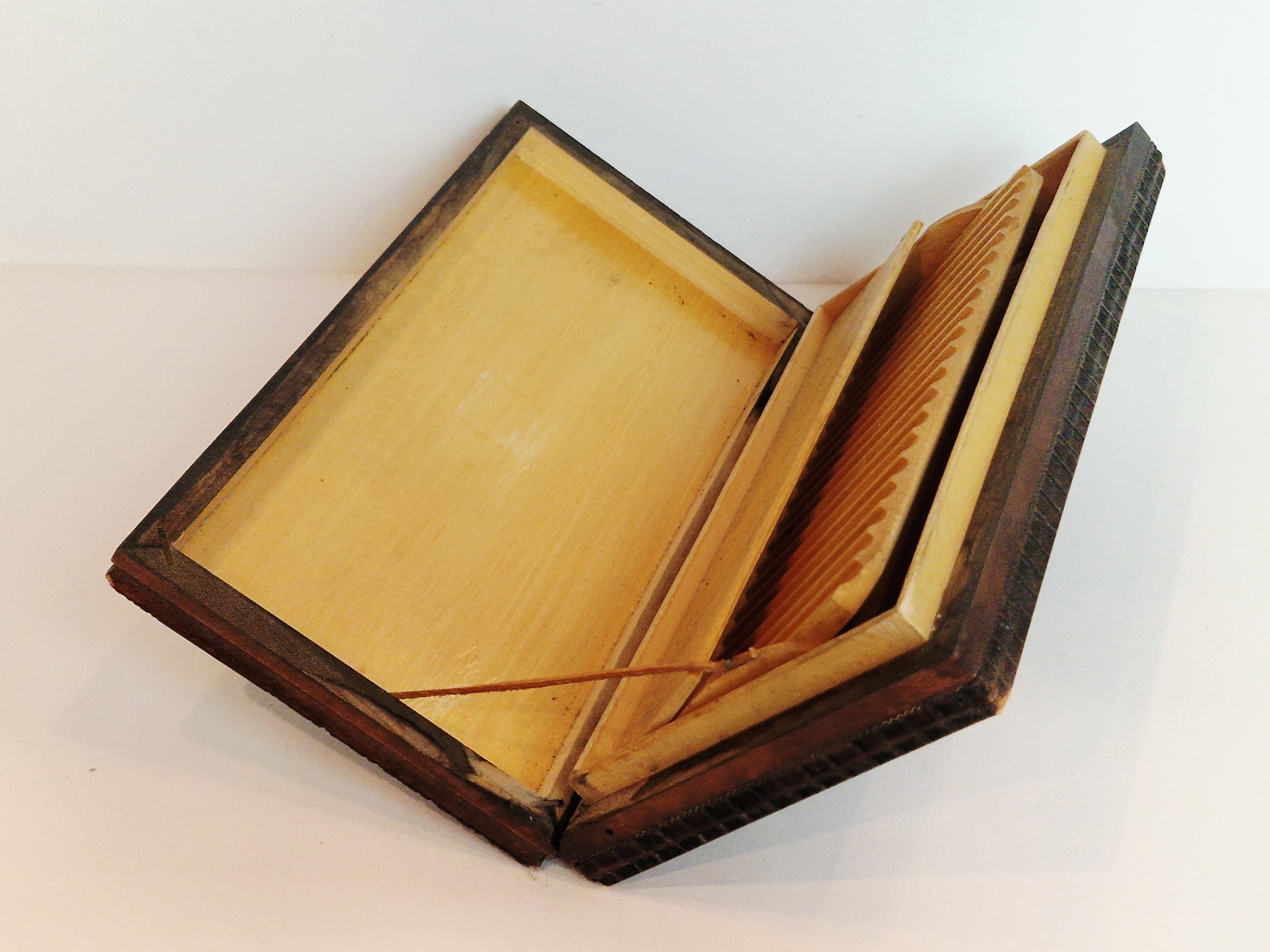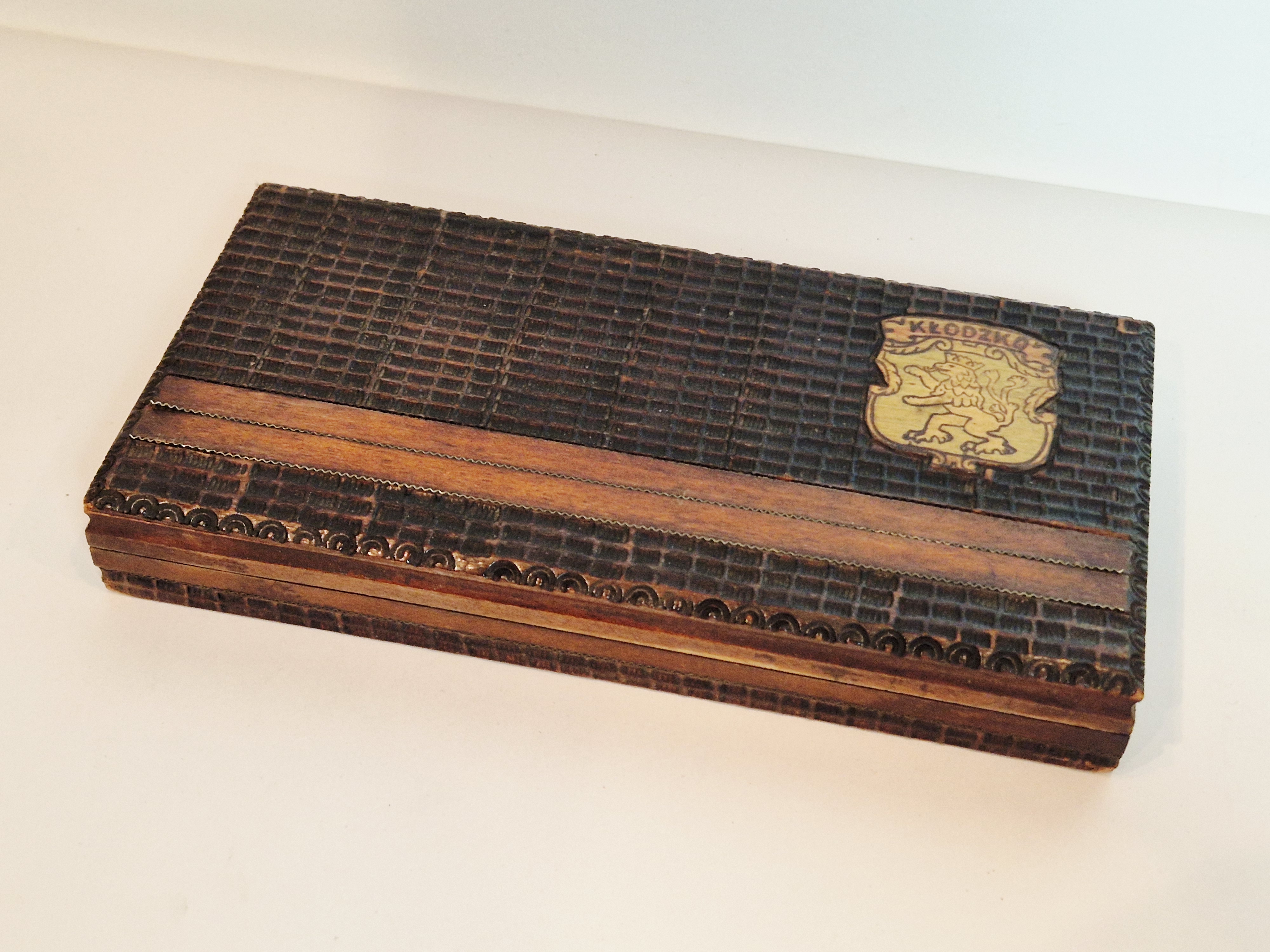STARA (l. 70-te XX w) MISTERNIE ZDOBIONA (wypalanie) DREWNIANA SZKATUŁKA - PAPIEROŚNICA