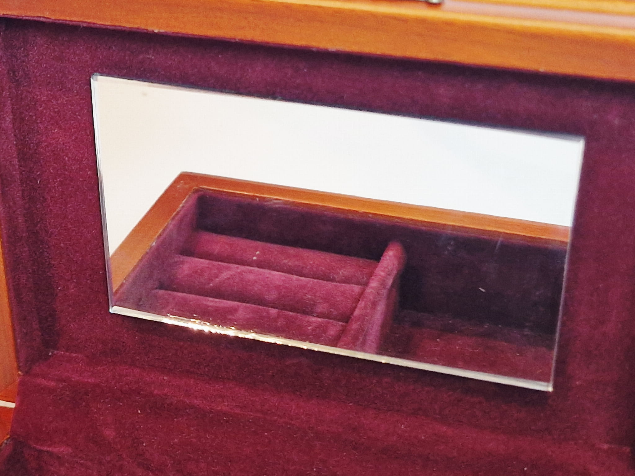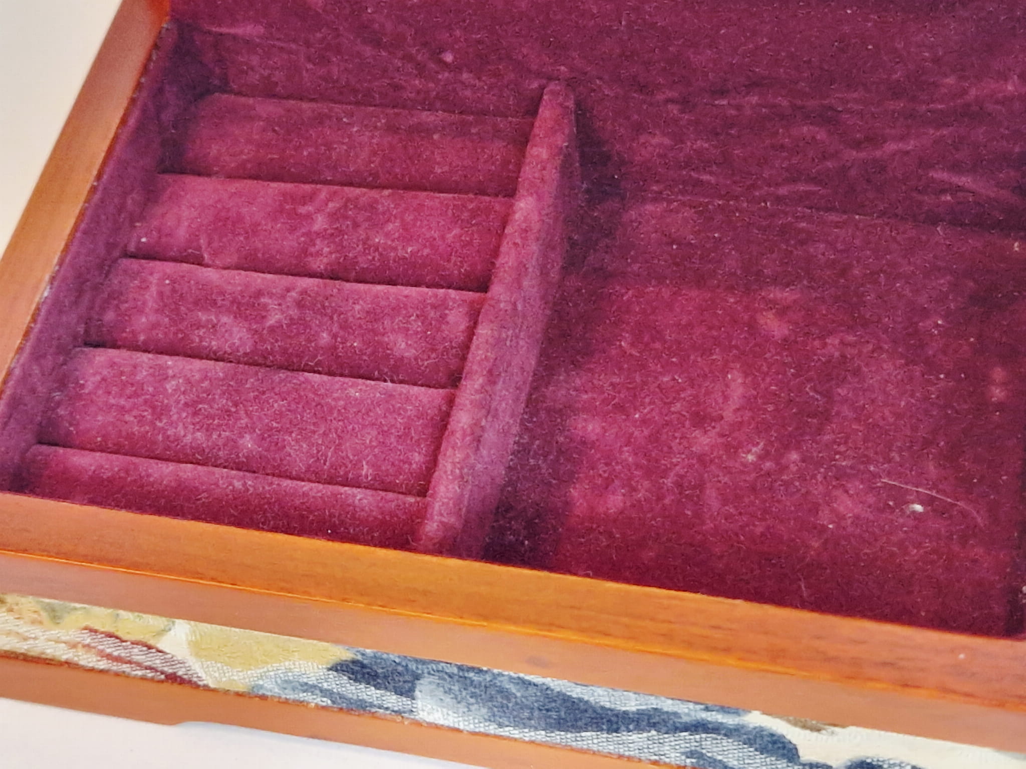 Wnętrze szkatułki z przegródkami wyściełanymi bordowym aksamitem...