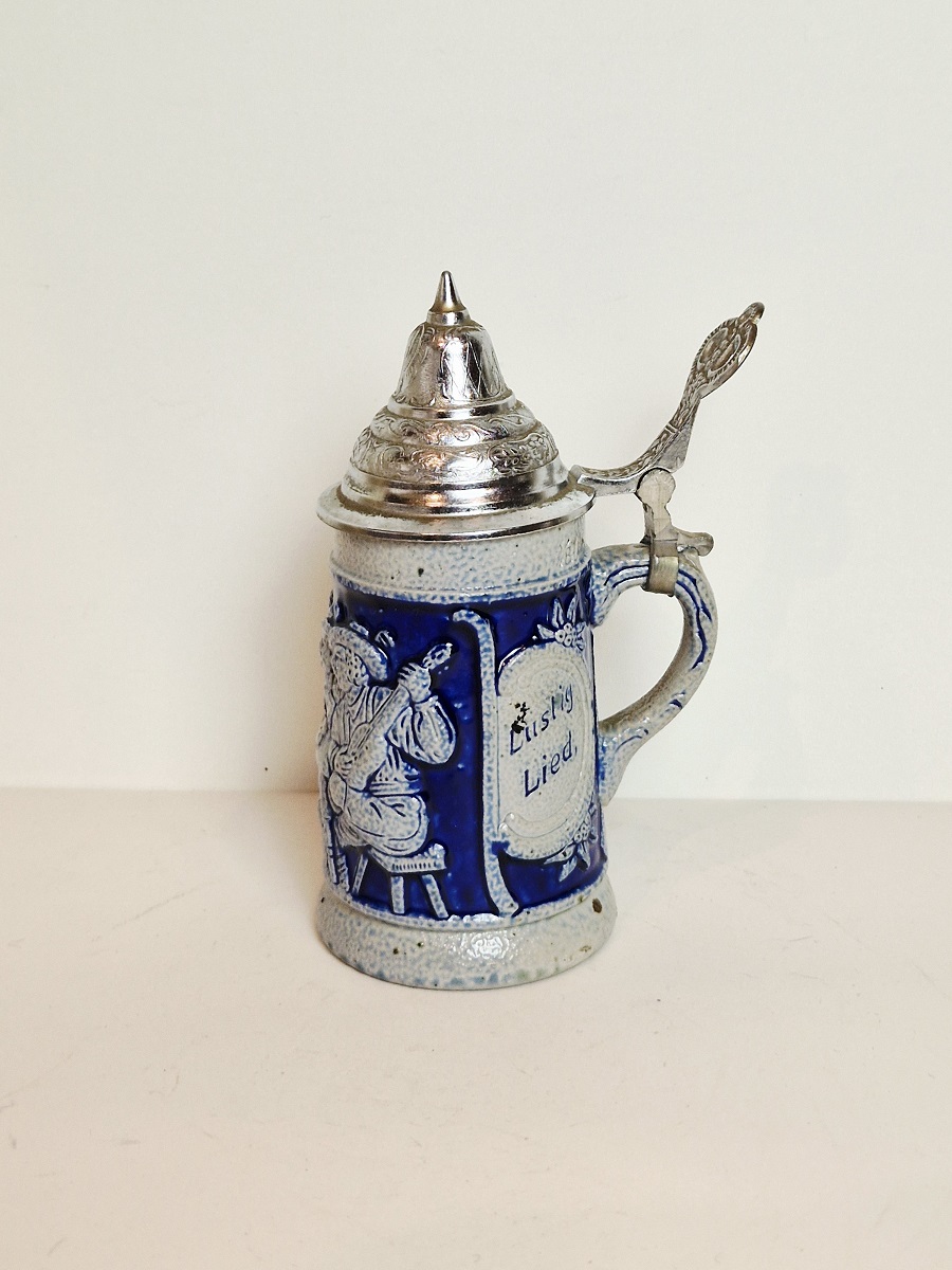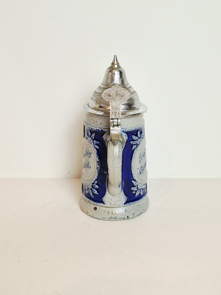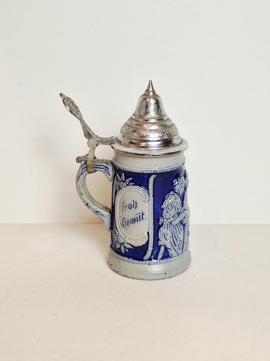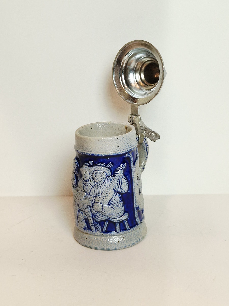 STARY (l. 90-te XX w) Mały (1/8 l) KUFEL KAMIONKOWY (szkliwienie solne / 3D) Z CYNOWĄ POKRYWKĄ