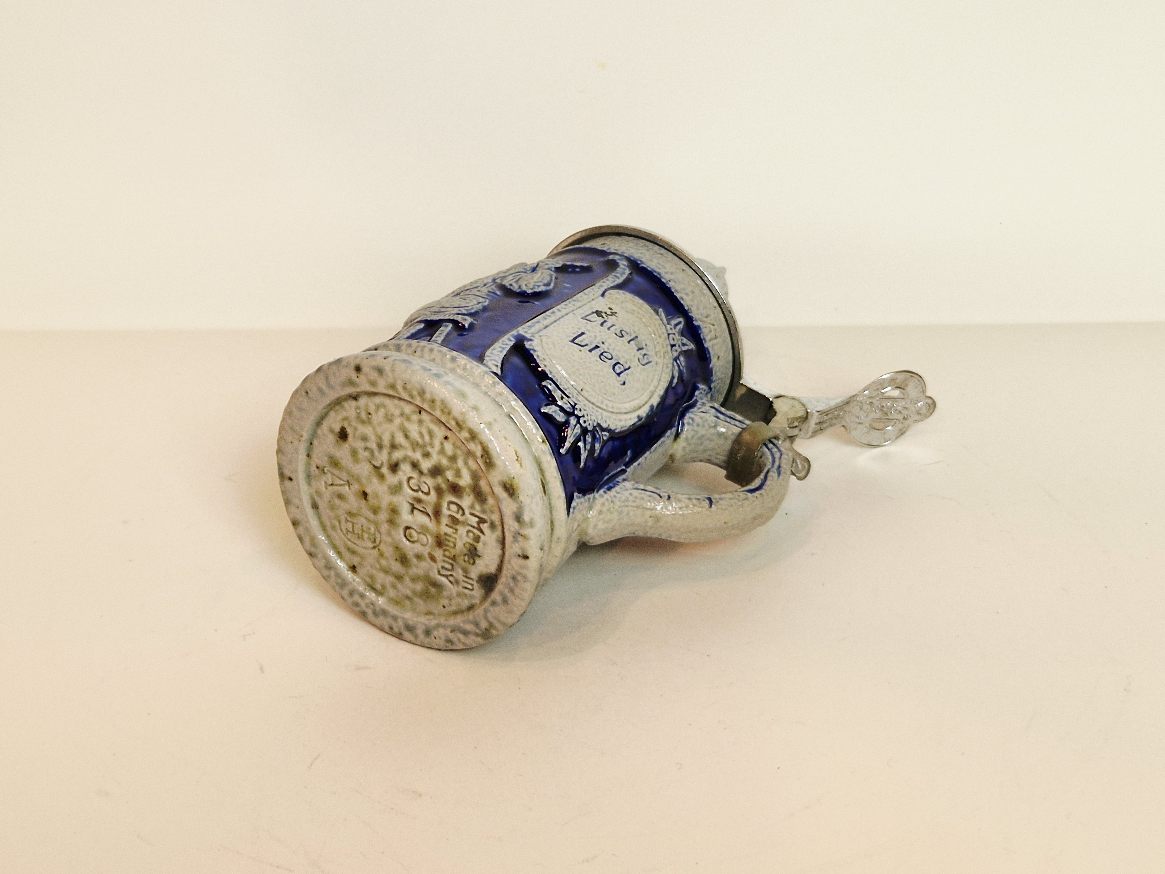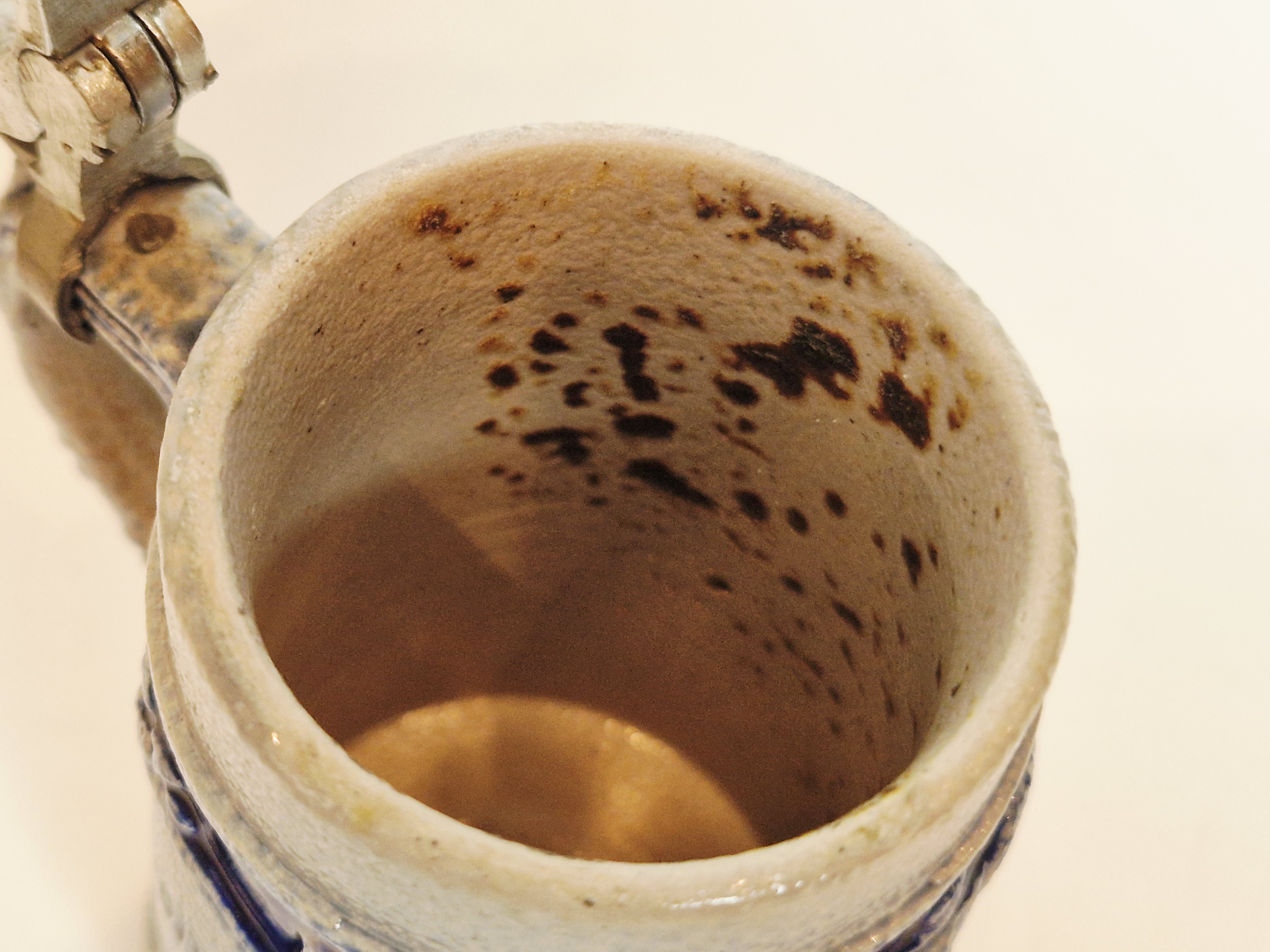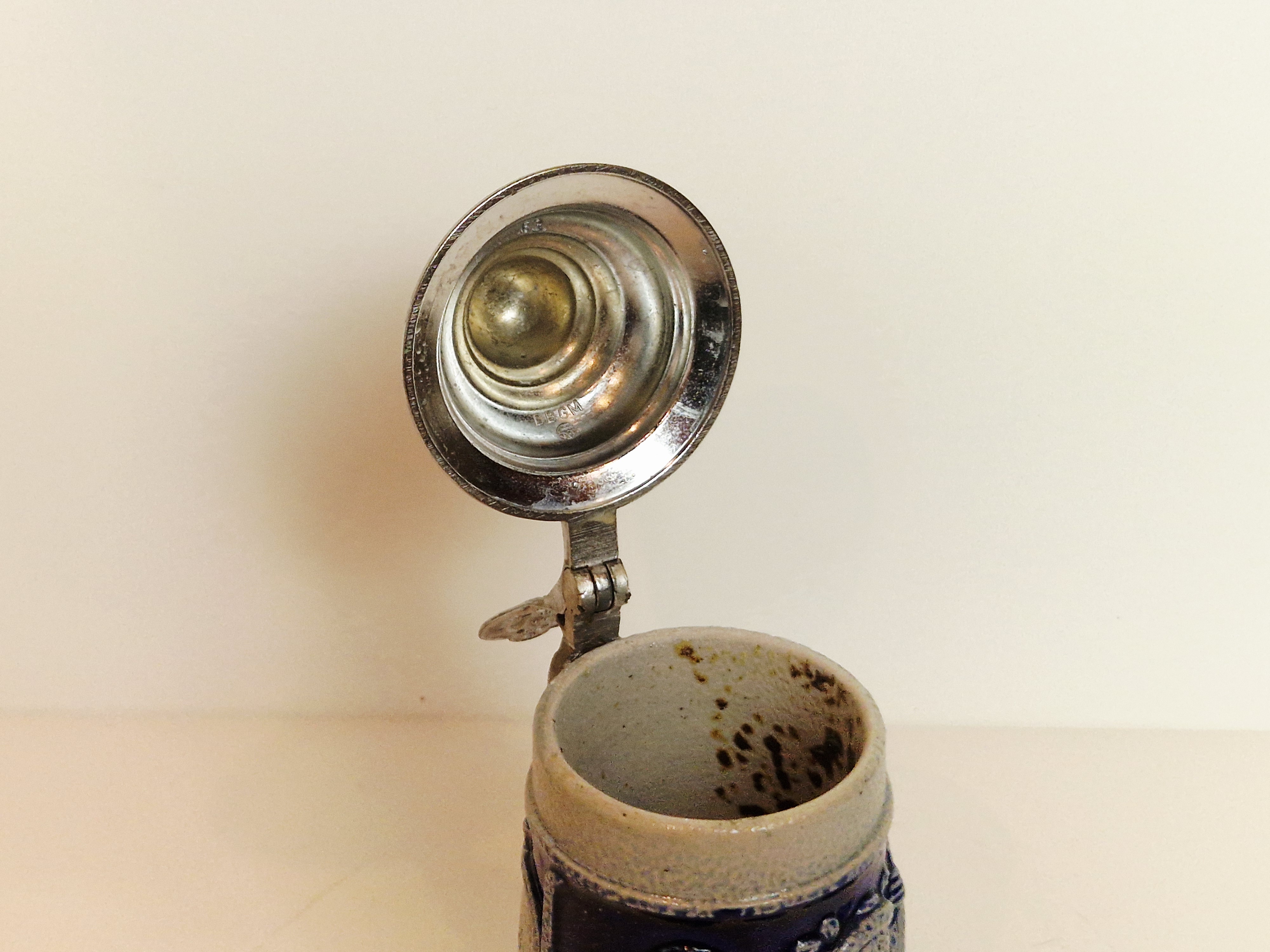 STARY (l. 90-te XX w) Mały (1/8 l) KUFEL KAMIONKOWY (szkliwienie solne / 3D) Z CYNOWĄ POKRYWKĄ