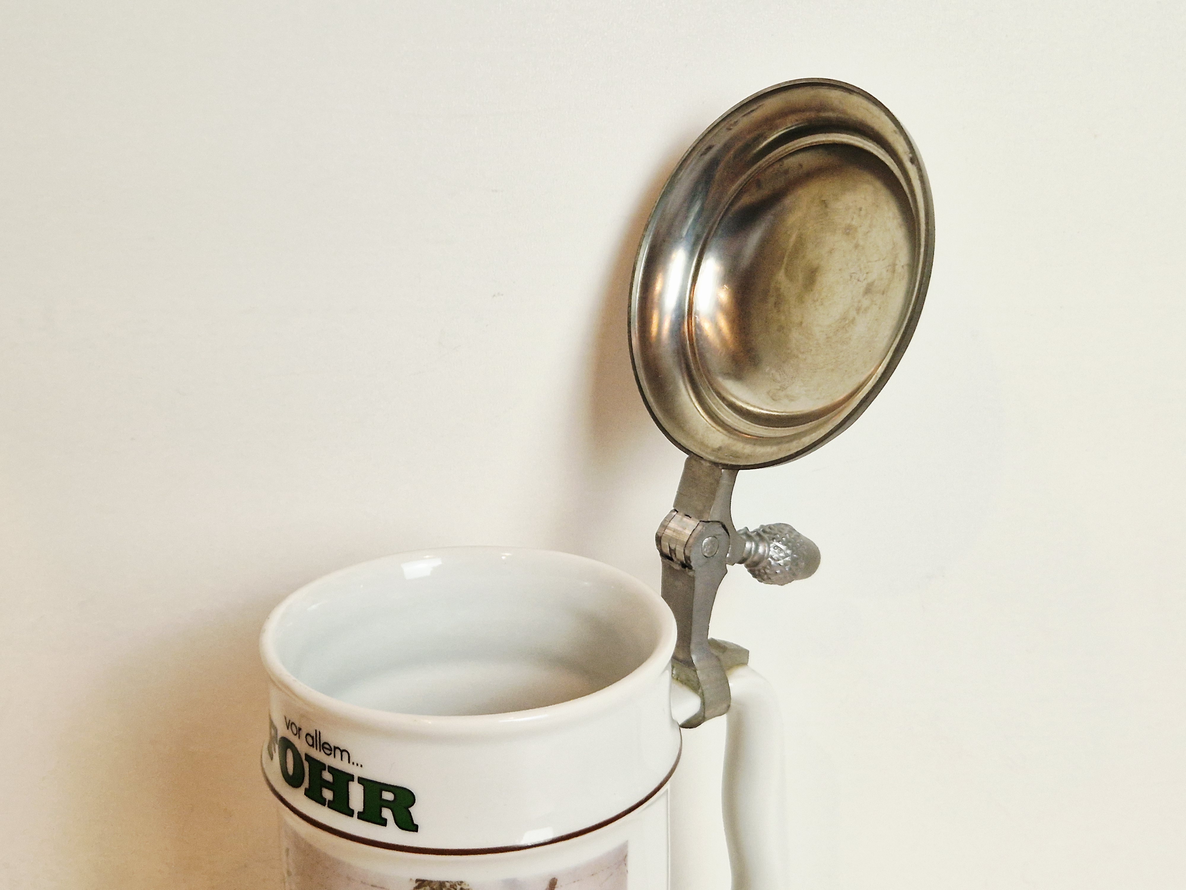 STARY (l. 90-te XX w) KOLEKCJONERSKI KUFEL CERAMICZNY Z CYNOWĄ POKRYWKĄ
